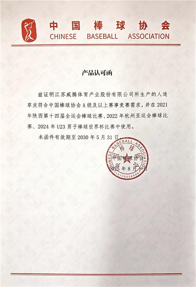 威腾体育作为国家体育总局手曲棒垒球运动管理中心战略合作伙伴、中国棒球协会人造草供应商,将依托其在体育设施领域的专业优势,为棒球场地建设提供技术支撑与创新解决方案,深化产学研合作,助力打造绿色低碳的高标准棒球场地,推动棒球运动走进更多学校和社区,为实现"全民健身"战略注入新动能。责任编辑:任芯仪(EN063)