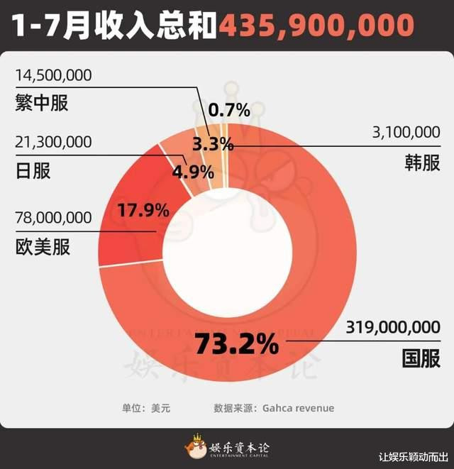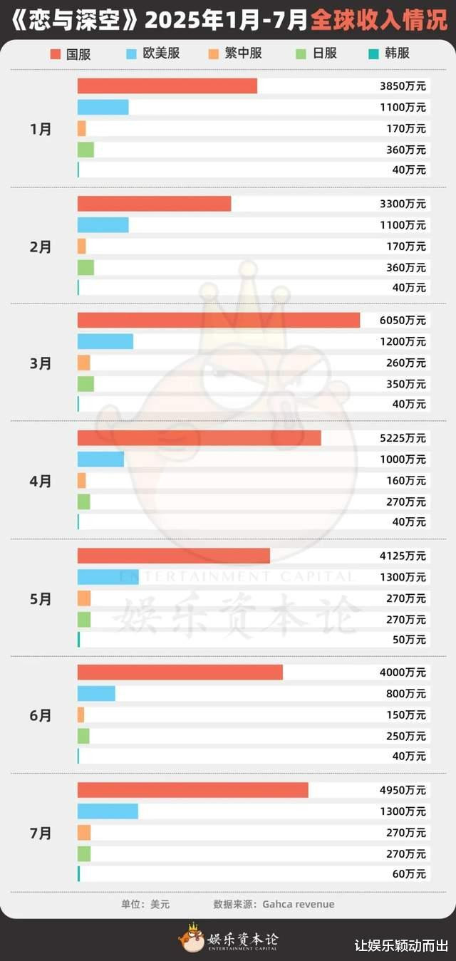 根据官方公开数据,《恋与深空》全球共有7000万玩家,QuestMobile的统计则称,国内活跃玩家为419.5万。即使按照最极端的情况,7000万玩家中仅有1000万为活跃用户,国内玩家贡献的流水也很惊人——不到500万人7个月贡献3亿美金流水,其余包括欧美地区在内的玩家贡献流水1亿美金出头,仅为国服三分之一。