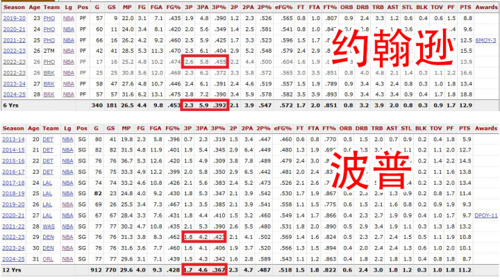 如上图所示,不论生涯39.2%三分率、场均2.3球还是最高季45.5%三分率、场均2.6球,约翰逊都是远强于波普。都是三分为主要终结方式,当约基奇对波普有加成下显然对约翰逊也是有加成的。三分能力出色,这是其二。