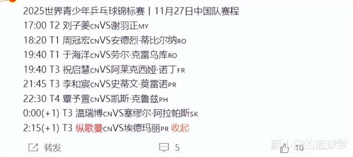 纵歌曼首场的U19世青赛女单的时间已经确定,她的对手是埃德玛丽,大家继续期待这位19岁的年轻小将吧,她2023年12月底才入选国乒一队希望她能继续进步。