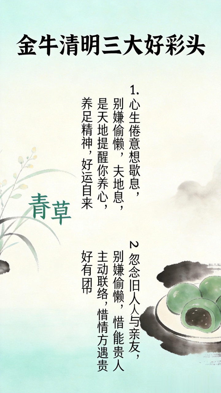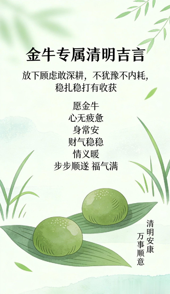 等到自己步入社会,扛起家庭的担子,被柴米油盐、工作琐事裹着往前走,才渐渐读懂清明的意义。它不只是追思故人、感念先辈的日子,更是专属于金牛座的稳心时刻,提醒着向来踏实肯干的我们,别只顾着埋头赶路,也要适时停步养心,心稳了,路才能走得更顺。