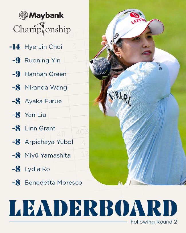 韩国26岁选手昨天打出64杆,取得首轮领先,今天交出66杆,两轮成绩为130杆(64-66),低于标准杆14杆。
