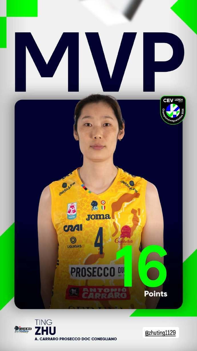 此外,朱婷还有4次拦网直接得分,贡献16分的她,力压13分的队友哈克和11分的队友加比,当选了本场MVP。值得注意的是,在朱婷领奖时,以德吉纳罗为首的队友,策划一起模仿朱婷的招牌庆祝动作,向她致敬,这一幕也可谓相当温馨。