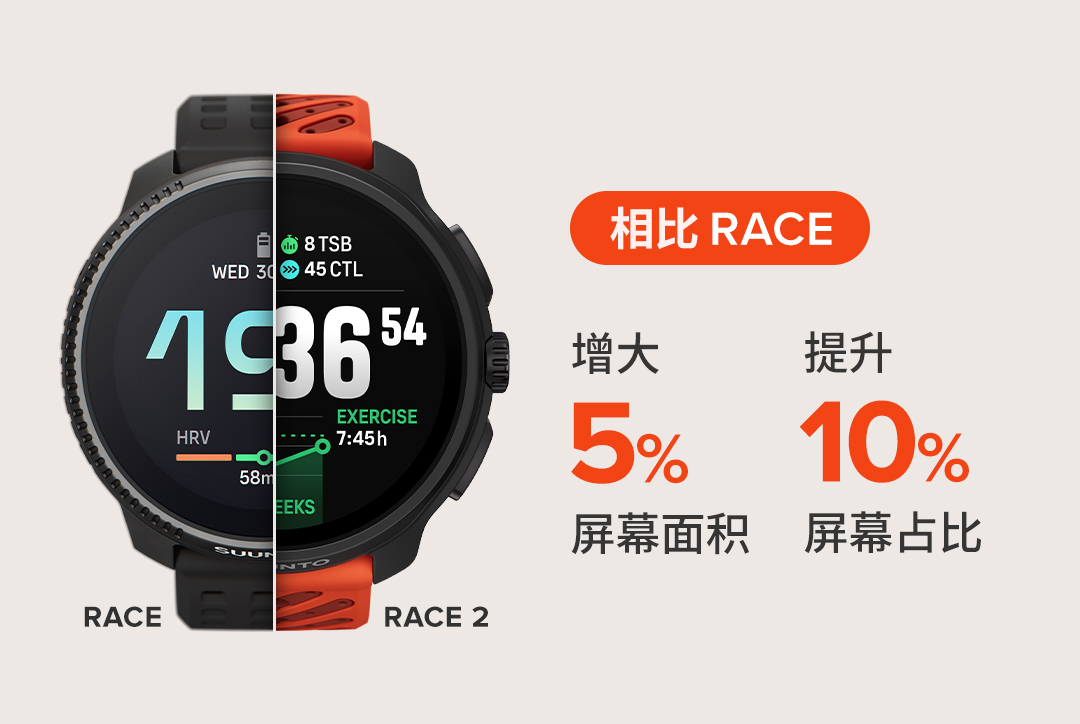 相较于两年前问世的初代 Race,Suunto Race 2 实现腕表屏幕的全面进化。新一代 1.5 英寸 LTPO AMOLED 高清触控显示屏以更大视野重塑交互体验——屏幕面积增加 5%,屏占比提升 10%,成就开阔的视觉界面。