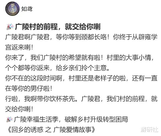 先是《光与夜之恋》在游戏内实装了“丰果农场”系统,紧接着不久《恋与制作人》放出七夕“建设四季农场”主题返场,而《如鸢》那边的情况也不简单,直接将活动命名为“回乡的诱惑之广陵爱情故事”。