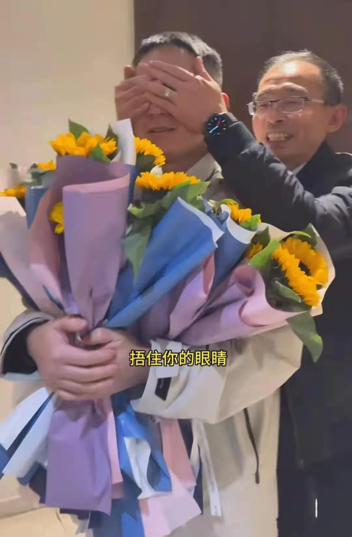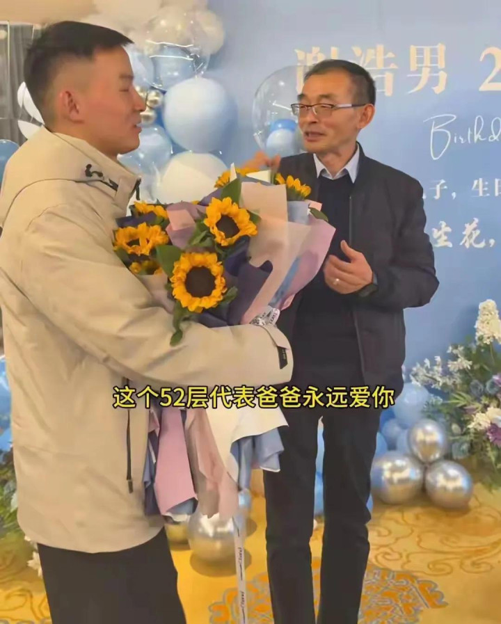 谢岳专门挑选了一家酒店的52层包间,请儿子吃饭,还在包间门口安排了五位工作人员,每个人拿着27枝向日葵,送给谢浩男。